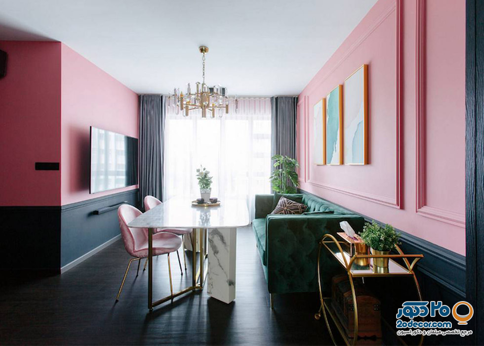 یکی از جاهایی که از رنگ صورتی در طراحی دکوراسیون داخلی میتوان استفاده کرد دیوارها هستند. البته نباید برای رنگآمیزی دیوارها از صورتی جیغ استفاده کرد چراکه شبیه اتاق دختربچهها خواهد شد بلکه باید از صورتیهای خنثی و کمرنگ برای دیوارها استفاده کرد و یا تنها برخی از دیوارها را صورتی کرد تا خیلی شلوغ به نظر نرسد و دیوارهای کناری آن را با سفید رنگآمیزی نمایید همچنین میتوانید از کاغذدیواریهای صورتی و سفید نیز استفاده کنید.