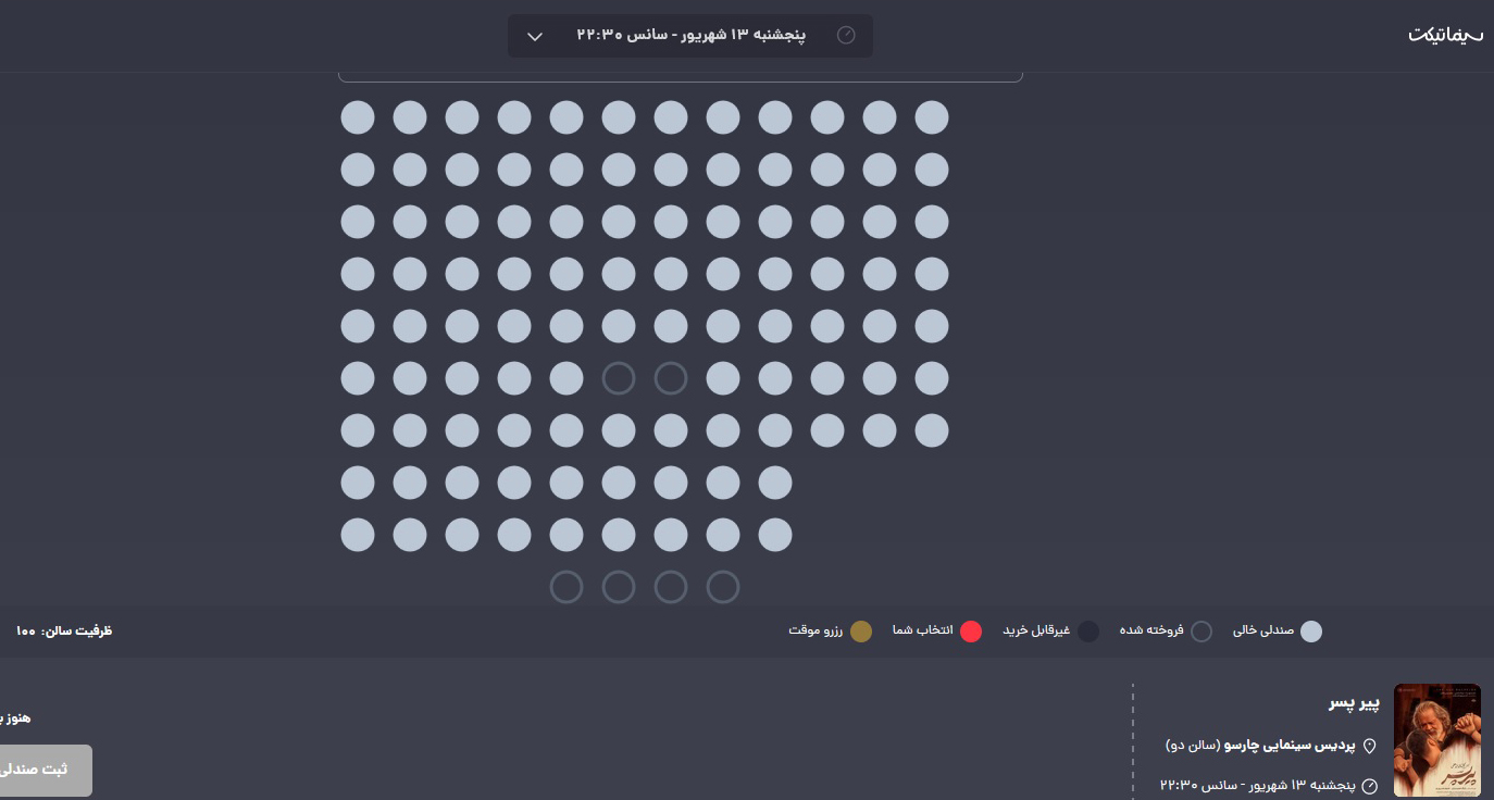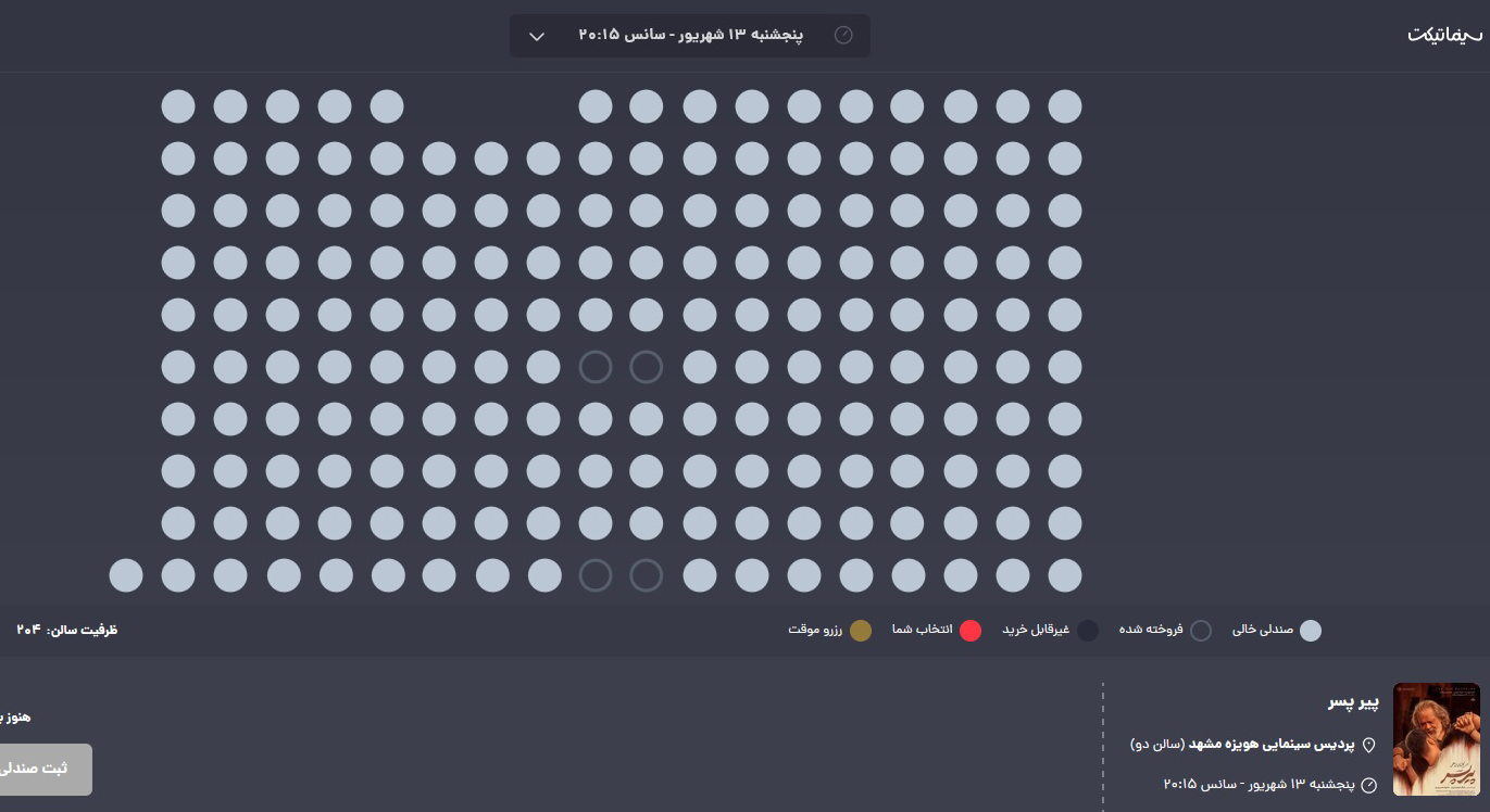 در طی همین بررسی و در همین تاریخ پنجشنبه 13 شهریور 1404 این سالن های سینمای نمایش دهنده "پیرپسر" به طور کلی خالی بودند: