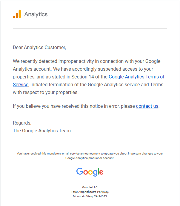 , We recently detected improper activity in connection with your Google Analytics account. We have accordingly suspended access to your properties, and as stated in Section 14 of the Google Analytics Terms of Service, initiated termination of the Google Analytics service and Terms with respect to your properties. If you believe you have received this notice in error, please contact us.