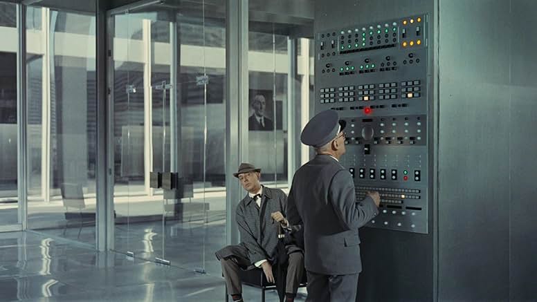 دو بال اصلی فیلم در ارائهی جلوههای بصری چشمنواز، فیلمبرداری و معماری خشک و صنعتی آن هستند که تمرکز اصلی آنها در دو پردهی اول میباشد. در طراحی صحنه، تاتی از معماری شیشهای و خطوط سرد و متقارن استفاده میکند تا بیهویتی مدرن را تصویر کند. راهروها طولانی، دیوارها قدکشیده و بلند، قابها اغلب ایستا و از نمای دور؛ گویی انسان در دل سازهها گم شده است.