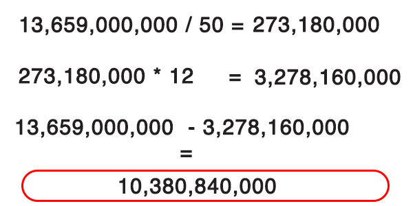 برای توضیح این مسئله فرض کنید که دارایی مورد مثال که ارزش روز آن بر مبنای تورم پایه، ۱۳ میلیارد و ششصد و پنجاه و نه میلیون تومان به دست آمده است، یک قلم و دارای طول عمری ۵۰ ساله باشد. در چنین حالتی دارایی به اندازه کسر ۱۲ سال از ۵۰ سال مستهلک شده و باید این ارزش از آن کسر شود. (۱۲ سال فاصله سال ۸۴ تا ۹۶ است.) بنابراین: