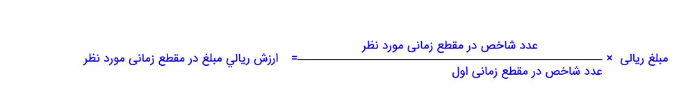 اگر بخواهیم ارزش این داراییها در سال ۱۳۹۶ را به دست آوریم، مطابق فرمول بالا باید مقدار شاخص در سال ۹۶، معادل ۱۰۹.۶ را بر مقدار شاخص در سال ۸۴ (زمان خرید داراییها) تقسیم کنیم. آنگاه نسبت به دست آمده را در ارزش دفتری داراییها ضرب میکنیم تا قیمت روز داراییها به دست آید: ۱۳ میلیارد و ششصد و پنجاه و نه میلیون تومان در سال ۹۶