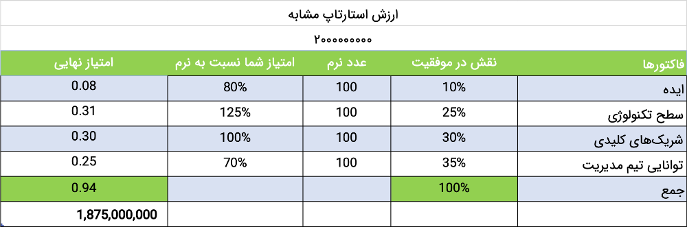 مطابق تصویر بالا ابتدا معیارها و میزان نقش آنها در موفقیت استارتاپ به درصد مشخص شدهاند. سپس عدد ۱۰۰ به عنوان عدد نرم در نظر گرفته شده و به هر ۴ عامل درصدی با توجه به عدد نرم (پایینتر یا بالاتر از آن) اختصاص داده شده است. در نهایت مقادیر ۲ ستون «نقش در موفقیت» و «امتیاز شما نسبت به نرم» در ردیفهای متناظر در هم ضرب شدهاند تا امتیاز نهایی هر معیار مشخص شود. نهایتا این امتیازات با هم جمع شده و درصد کل به دست آمده به عنوان یک ضریب در عدد ۲ میلیارد ضرب شده است تا رقم ۱ میلیارد و ۸۷۵ میلیون به عنوان ارزش استارتاپ مشخص شود.