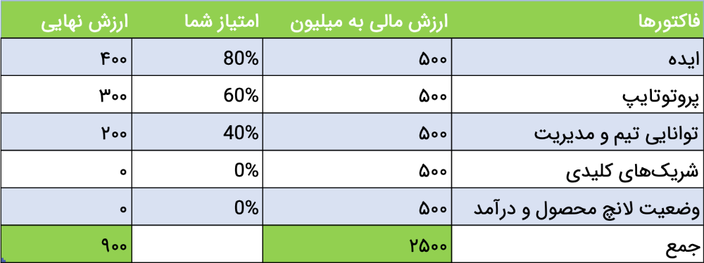 ۵ فاکتور که ارزش نهایی هر کدام ۵۰۰ میلیون تومان است. در این صورت جمع سقف این ارزشها عدد ۲.۵ میلیارد تومان را به دست میدهد. منتاها مسئله اینجاست که معدل کل استارتاپ ما ۲۰ نیست و در هر فاکتور باید امتیازی را از ۰ تا ۱۰۰ درصد به خود اختصاص دهیم. براساس ارزیابیها، برای هر معیار امتيازى به استارتاپ تعلق میگیرد که در سقف ارزش هر معیار ضرب میشود. نهایتا اگرچه بیشینهی ارزش استارتاپ ۲.۵ میلیارد تومان بوده ولی استارتاپ ما براساس ارزیابی ۹۰۰ میلیون تومان ارزشگذاری شده است.