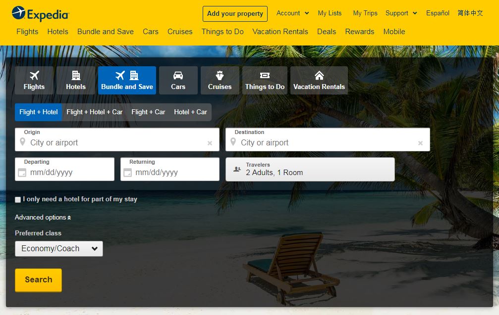 گروه اکسپدیا در واقع یک سازمان مسافرتی بزرگ است که چندین وبسایت در زمینههای رزرو بلیط هواپیما و قطار، کرایهی تاکسی، رزرو هتل، تولید محتوای گردشگری، اخبار گردشگری و … دارد. صفحهی اصلی این گروه به شکل زیر است.