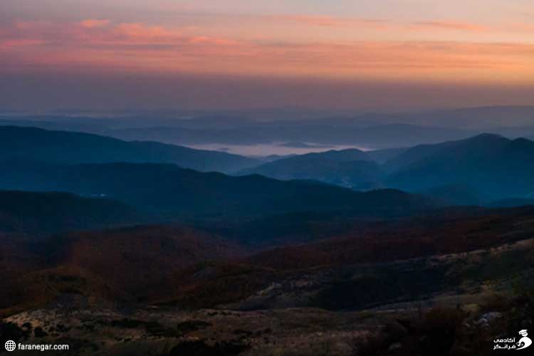 این تصویر در هنگام طلوع آفتاب در فصل پاییز و در ارتفاعات فیروزکوه گرفته شده است. آسمان مقداری به رنگ بنفش است و ابرها بخاطر تابش خورشید کم رمق صبح، به رنگ صورتی دیده میشود. هر چه در ارتفاعات بالاتر رفتهایم، از تراکم جنگل کم شده است و رنگ برگ درختان در هنگام طلوع آفتاب منطقه را سرخ کرده است و …