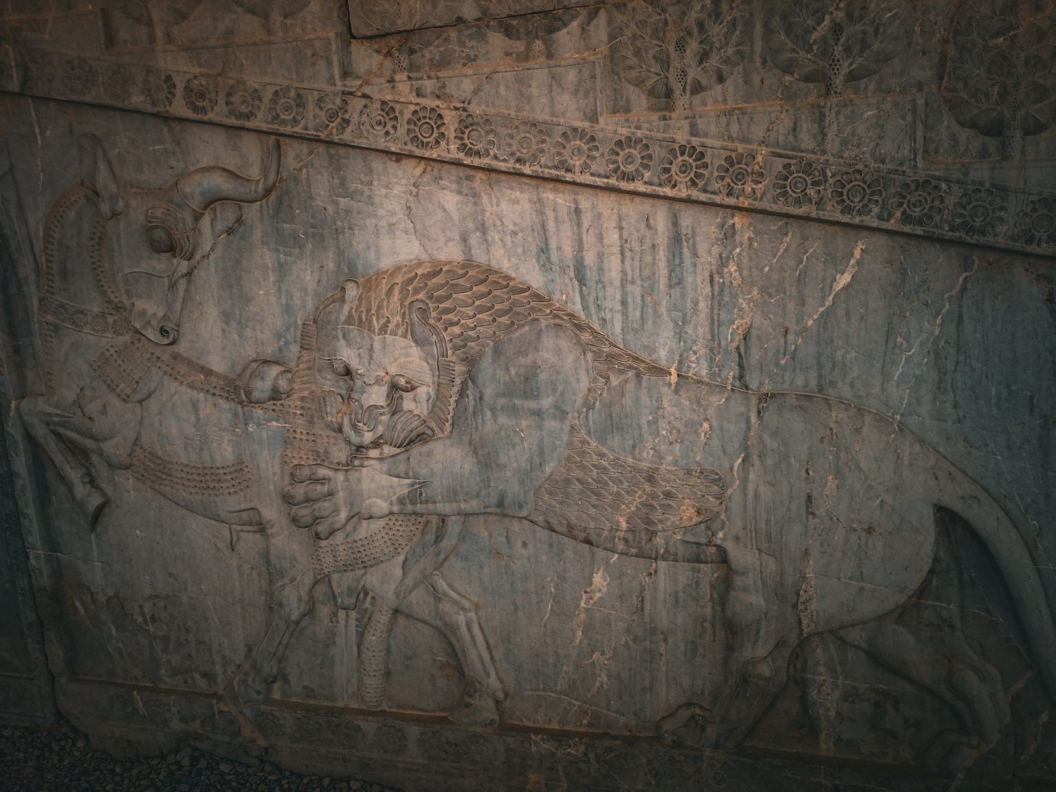 در تختجمشید، یک نقشبرجسته را چندین بار میبینیم: شیری که پهلوی گاوی را میدرد.