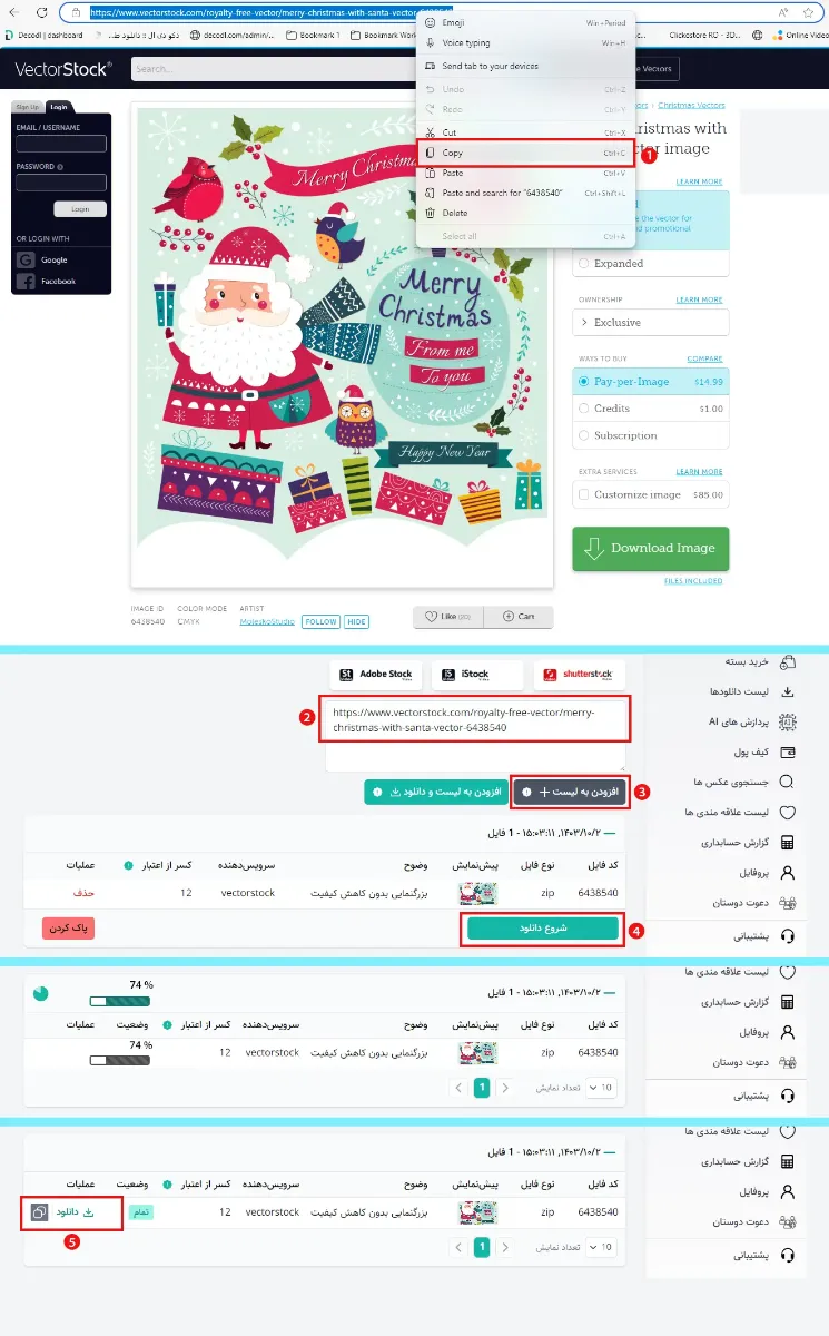 بعد از نمایش تصویر می توانید روی تصویر کلیک کنید و اطلاعات مربوط به تصویر که شامل: نام سرویس دهنده، اعتبار موردنیاز، دکمه دانلود، افزودن به صف دانلود، تصاویر مشابه، علاقه مندی ها، فرمت تصویر، سایز و رزولوشن را مشاهده بکنید. در این روش فقط کافیست تا روی دکمه دانلود کلیک کنید تا فرآیند خرید اتوماتیک شروع شود و بعد از تمام عملیات لینک دانلود در اختیار شما قرار بگیرد. (طبق تصویر زیر 👇)