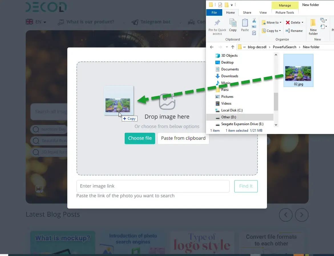 تصویر مورد نظر را از سیستم خود انتخاب کنید یا با موس بکشید و رها کنید.