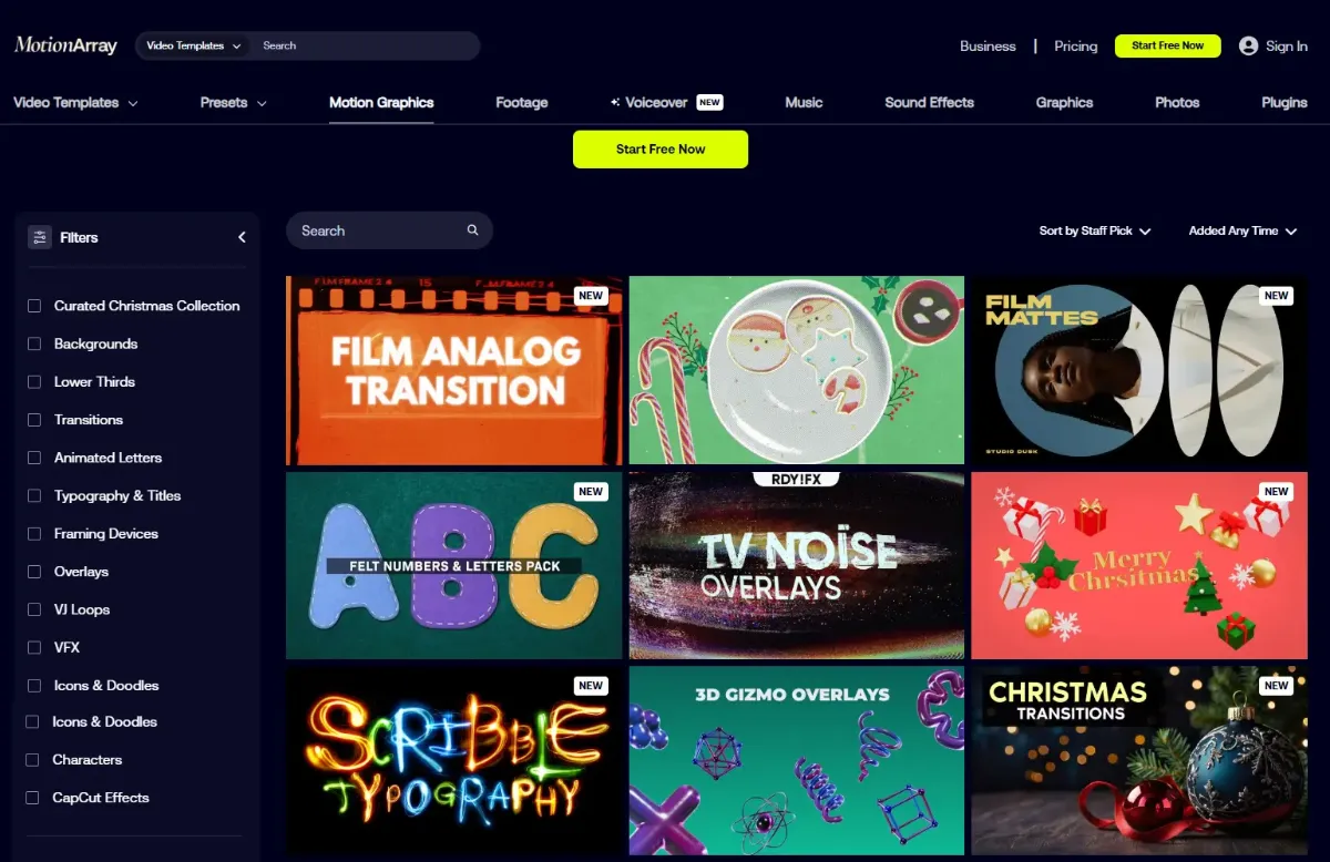 سایت Motion Array یکی از قدرتمندترین و شناختهشدهترین مراجع گرافیکی فعال برای تدوینگران و تولیدکنندگان محتوا بهحساب میآید. این سایت دارای مجموعهای گستردهای از فوتیجها، موشنگرافیک، موسیقی، ویدئوهای آماده، افکتهای صوتی، قالبهای پروژه و سایر ابزارهای مورد نیاز برای تولید محتوای دیجیتالی است.
