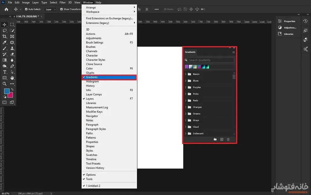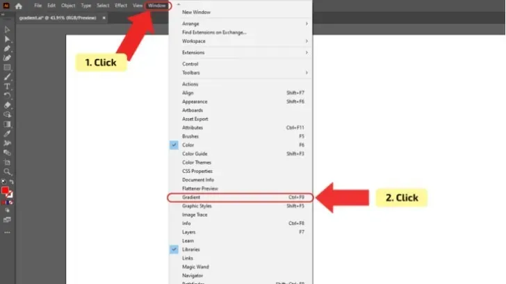 پنل گرادینت از مسیر Window > Gradient در دسترس است و امکان تنظیمات مختلف، از رنگ تا نوع گرادینت را فراهم میکند.