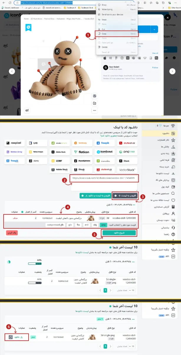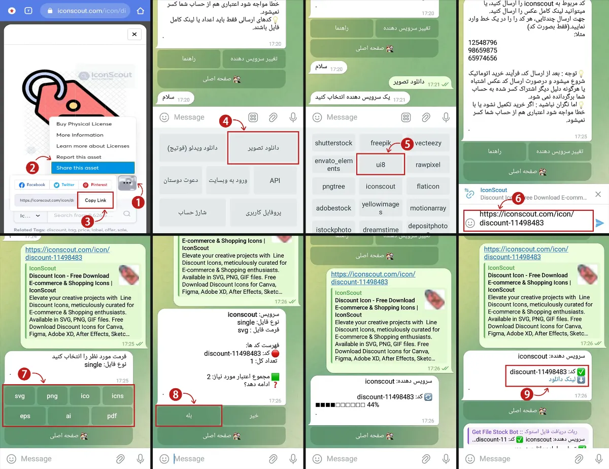 برای این منظور هم کافیست تا لینک موردنظر خود را کپی و وارد ربات تلگرامی شوید و از منوی پایین صفحه گزینه دانلود تصویر را انتخاب و از میان سرویس دهنده ها گزینه IconScout را انتخاب کنید و در گام بعدی لینک کپی شده خود را پیست کنید تا ربات شروع به پردازش نمایید. و بعد انجام عملیات پردازش مشخصات فایل و میزان اعتبار مورد نیاز را برای شما نمایش میدهد و در صورت تایید می توانید روی گزینه بله کلیک کنید تا عملیات خرید آغاز گردد و در کمتر از یک دقیقه لینک دانلود برای شما ارسال می گردد. (طبق تصویر زیر 👇)