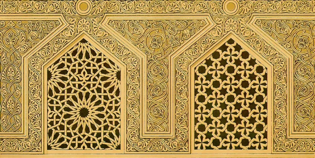 پترنهای اسلامی:اسلیمی و موریس: الگوهای هندسی و تزئینی که در مساجد و بناهای اسلامی یافت میشوند.