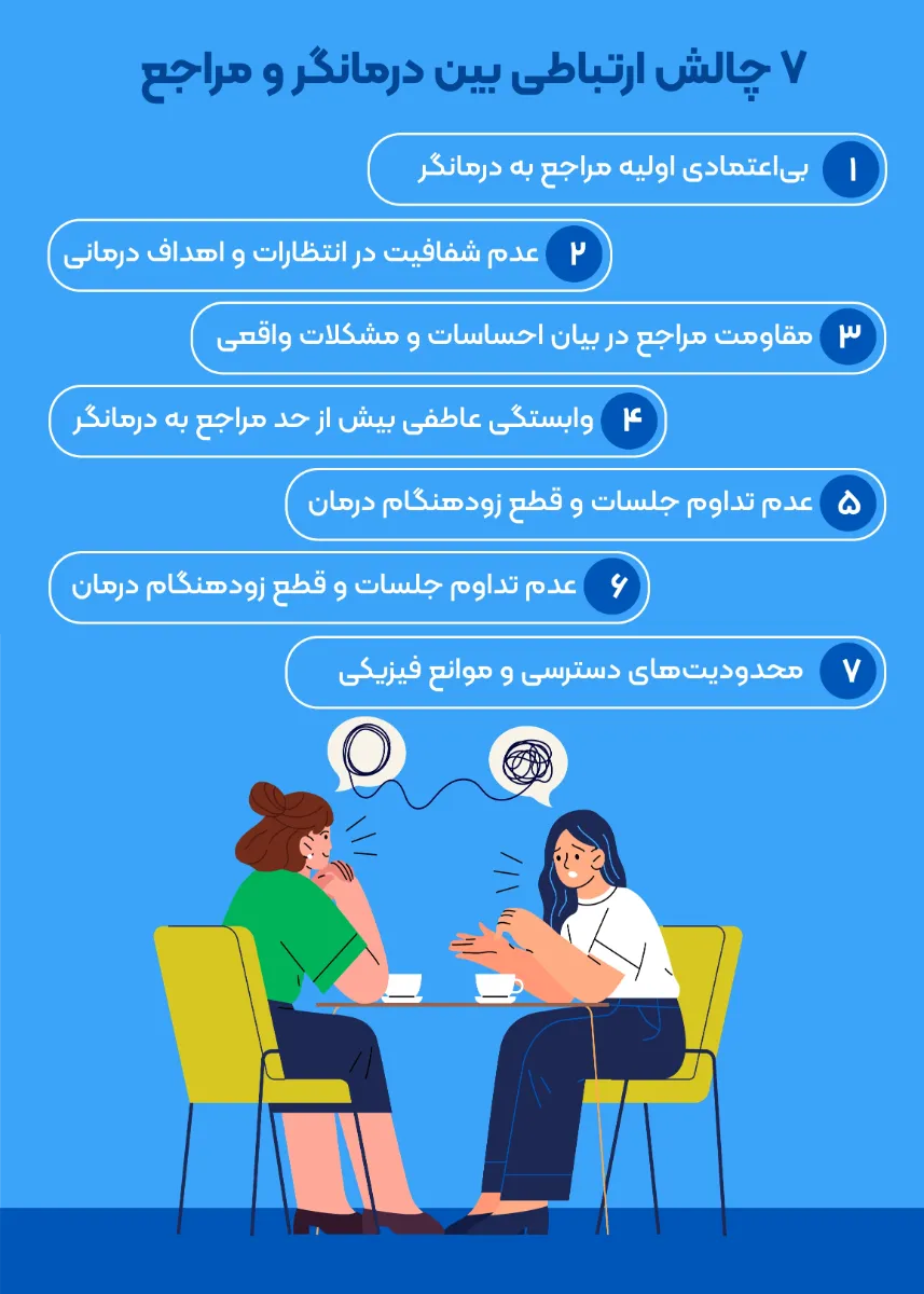 در ادامه 7 چالش ارتباطی بین درمانگر و مراجع را بررسی می کنیم و نشان می دهیم برای مقابله با این چالش ها باید از چه راهکارهایی استفاده کنیم.