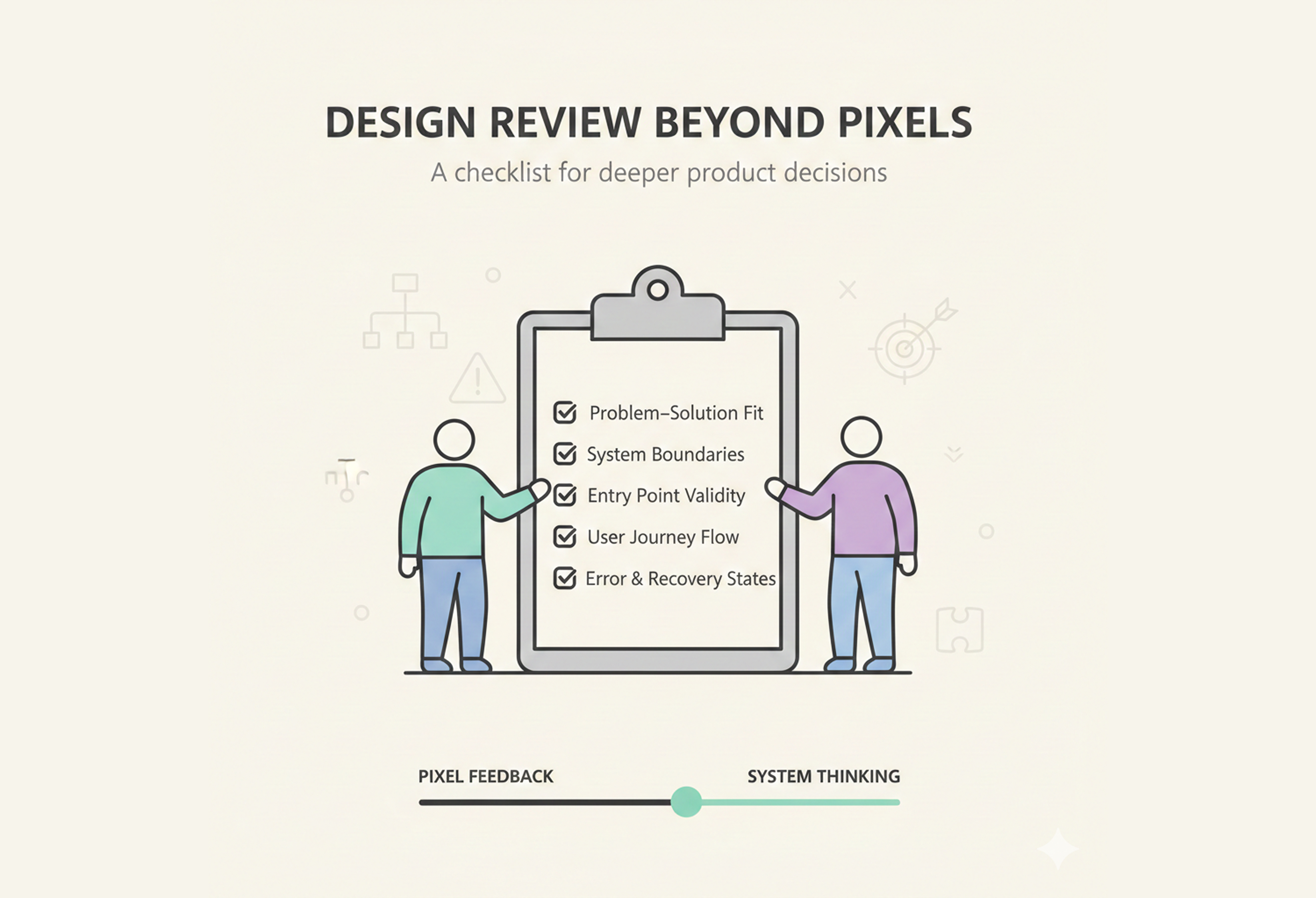 همین مشاهده باعث شد به این فکر کنم که شاید مشکل از نبودِ یک چارچوب ذهنی مشترک باشد؛ چیزی که کمک کند جلسه از سطح «ظاهر» عبور کند و وارد لایهٔ «تفکر طراحی» شود. به همین دلیل تصمیم گرفتم مجموعهای از سوالات کلیدی و راهنما آماده کنم؛ چکلیستی که قرار نیست همهٔ آن در هر جلسه بررسی شود، اما میتواند جهت گفتگو را تنظیم کند و یادآوری کند که Design Review قرار است کجا را روشنتر کند.