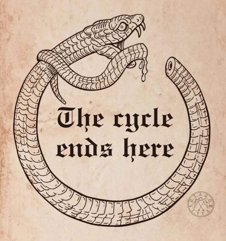 و او دارد خود را میخورد و نابود میکند، و ناگهان اوروبوروس دمِ به دهان خود را میکَنَد و چرخه تمام می شود.