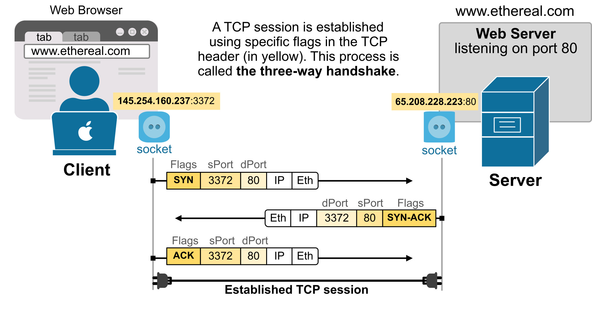 حال، بیایید تمرکز خود را به لایههای بالاتر مدل OSI معطوف کنیم. به یاد بیاورید که هر اتصال HTTP/HTTPS کلاینت-سرور با دستدهی سه طرفه TCP آغاز میشود، همانطور که در نمودار زیر نشان داده شده است.