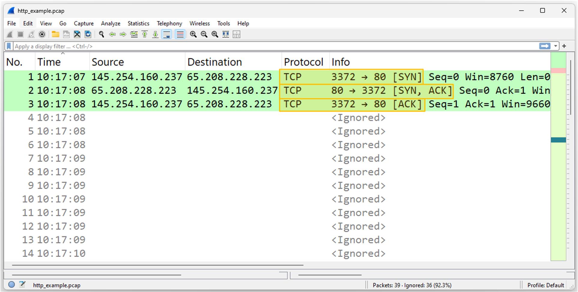 بیایید ببینیم این دستدهی TCP در داخل ابزار Wireshark چگونه به نظر میرسد. توجه داشته باشید که کلاینت و سرور سه بسته TCP (که صحیحتر سگمنت TCP نامیده میشوند) را مبادله میکنند که هیچ بار مفید دادهای را حمل نمیکنند. آنها فقط برای تأیید وجود اتصال شبکه بین کلاینت و سرور در لایه شبکه استفاده میشوند.