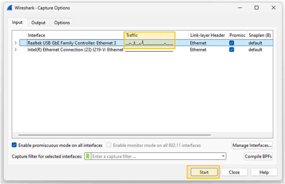 در نهایت، روی دکمه شروع (Start) در پایین پنجره کلیک میکنید تا ضبط ترافیک آغاز شود. اکنون باید بستههای شبکه را به صورت بلادرنگ مشاهده کنید.