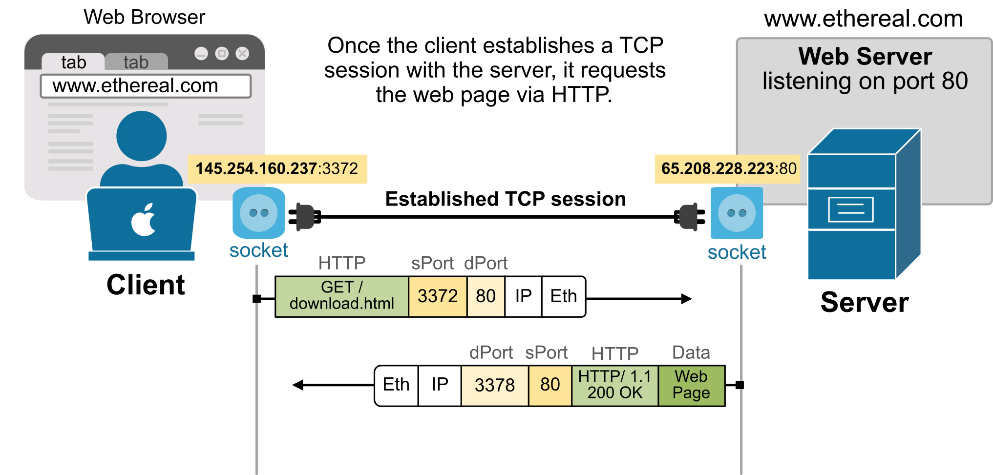 هنگامی که کلاینت یک اتصال TCP با سرور برقرار میکند، صفحه وبی را که کاربر میخواهد از طریق HTTP درخواست میکند، همانطور که در نمودار زیر نشان داده شده است.