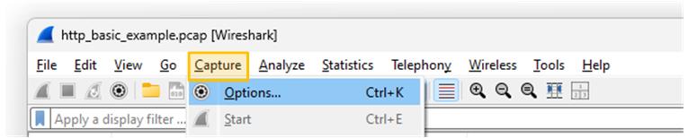 پس از نصب Wireshark بر روی کامپیوتر خود، به Capture > Options بروید، همانطور که در تصویر زیر نشان داده شده است.