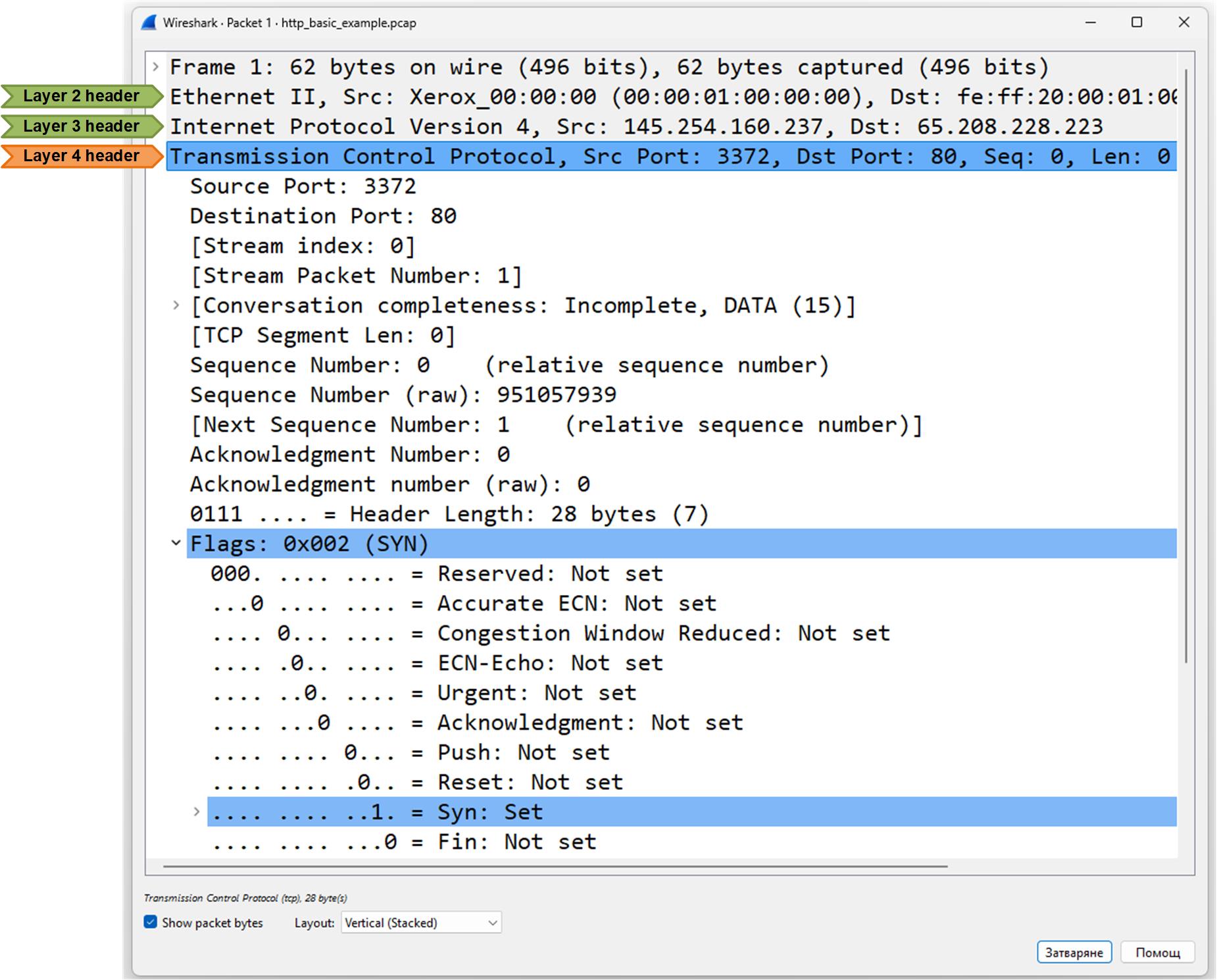 حال بیایید هدر TCP را باز کنیم و به محتوای آن نگاهی بیندازیم. این بسته شروع یک اتصال TCP است (بخشی از دستدهی سه طرفه).