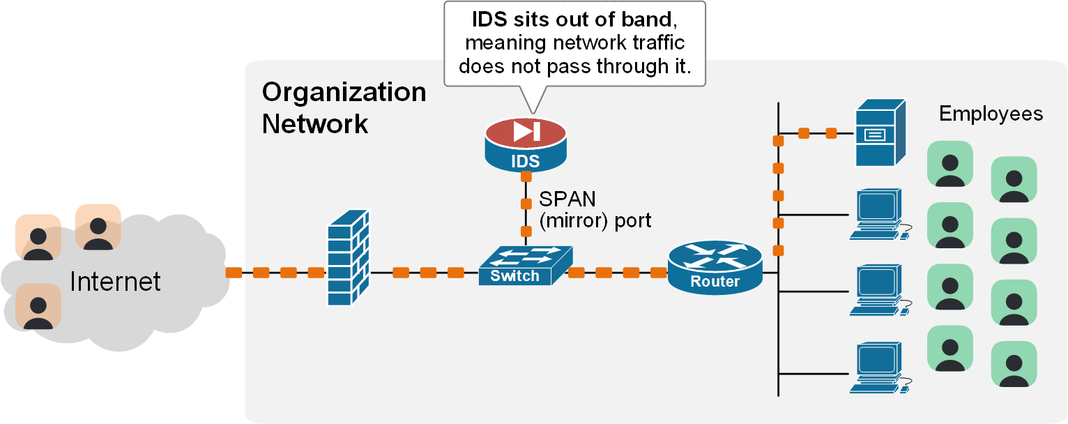 سیستم تشخیص نفوذ (IDS): یک دستگاه غیرفعال (Passive) است. ترافیک را مانیتور میکند و اگر تهدیدی پیدا کند، هشدار (Alert) صادر میکند. اما IDS ترافیک را متوقف نمیکند. مانند یک دوربین امنیتی است که دزدی را ضبط میکند اما جلوی او را نمیگیرد.