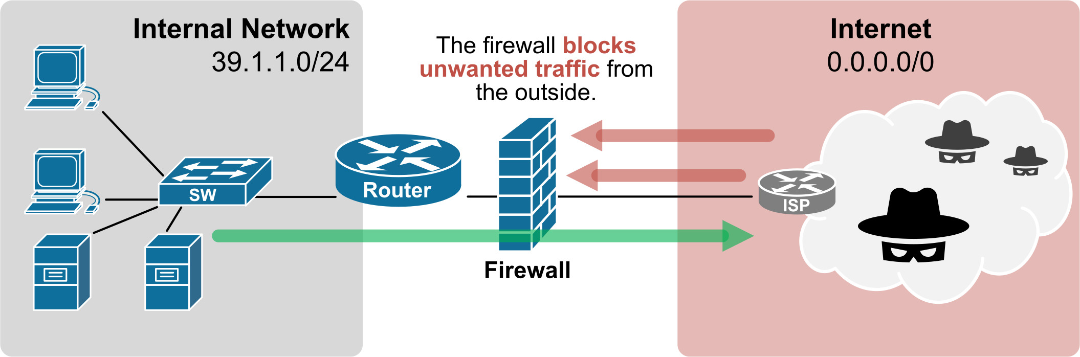 متداولترین وظیفه فایروال، مسدود کردن ترافیک ناخواسته از خارج است که قصد دسترسی به منابع شبکه داخلی را دارد، همانطور که در نمودار زیر نشان داده شده است.
