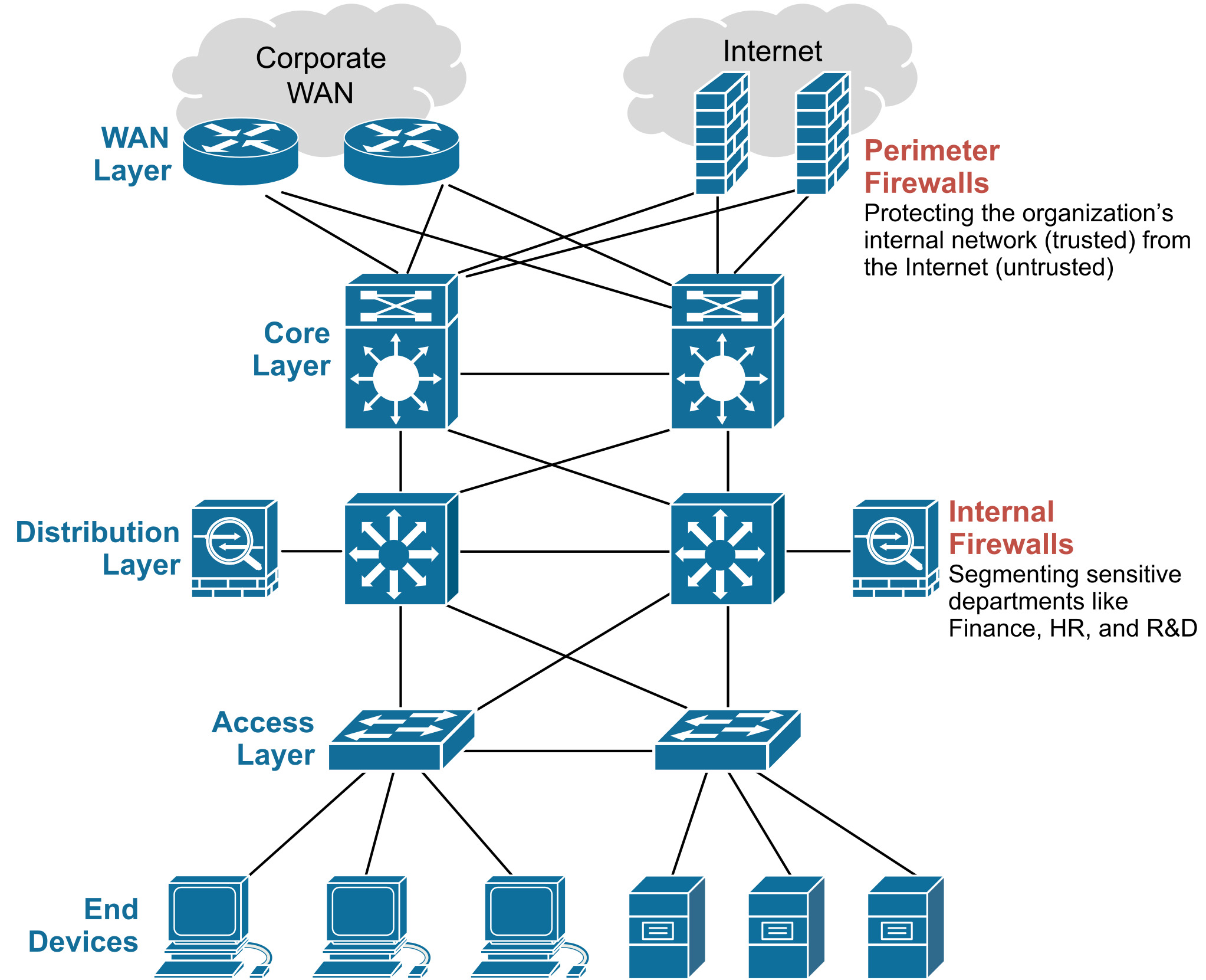 بیشتر سازمانها همچنین از فایروالهای داخلی برای تقسیمبندی شبکه (Segment the network) استفاده میکنند. به عنوان مثال، یک سازمان یک فایروال بین شبکههای کاربر و بخشهای حساس مانند مالی یا تحقیق و توسعه (R&D) قرار میدهد. این امر آسیب در صورت نفوذ مهاجم به داخل را محدود میکند و به اجرای کنترلهای دسترسی بین تیمها کمک میکند.