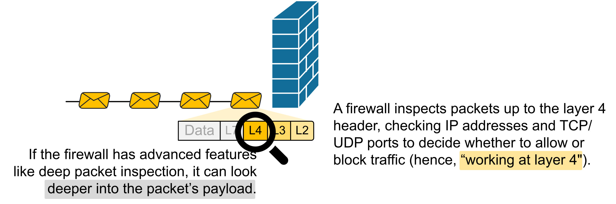 یک فایروال تا لایه 7 مدل OSI کار میکند. این بدان معناست که سرآیندهای لایه ۲، لایه ۳ و لایه ۴ را میخواند، همانطور که در نمودار زیر به رنگ زرد نشان داده شده است. فایروال تمام اطلاعات موجود را در اختیار دارد، مانند آدرسهای MAC، آدرسهای IP و شماره پورتها، و پروتکل انتقالی که استفاده شده است (TCP یا UDP).