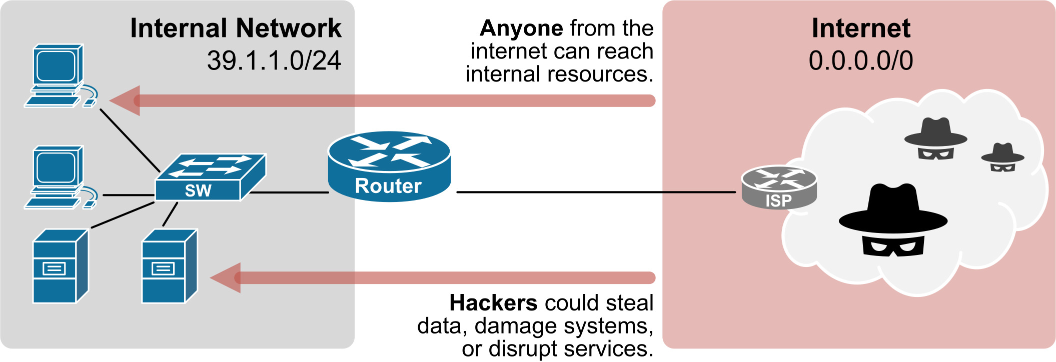 نمودار زیر یک شبکه داخلی کوچک را نشان میدهد که مستقیماً و بدون هیچ گونه محافظتی به اینترنت متصل است. سوئیچها و مسیریابها برای جابجایی ترافیک شبکه طراحی شدهاند، نه برای متوقف کردن حملات. هر کسی از خارج میتواند به منابع داخلی دسترسی پیدا کند و تلاش کند تا دادههای حساس را به سرقت ببرد یا خدمات ضروری را مختل کند.