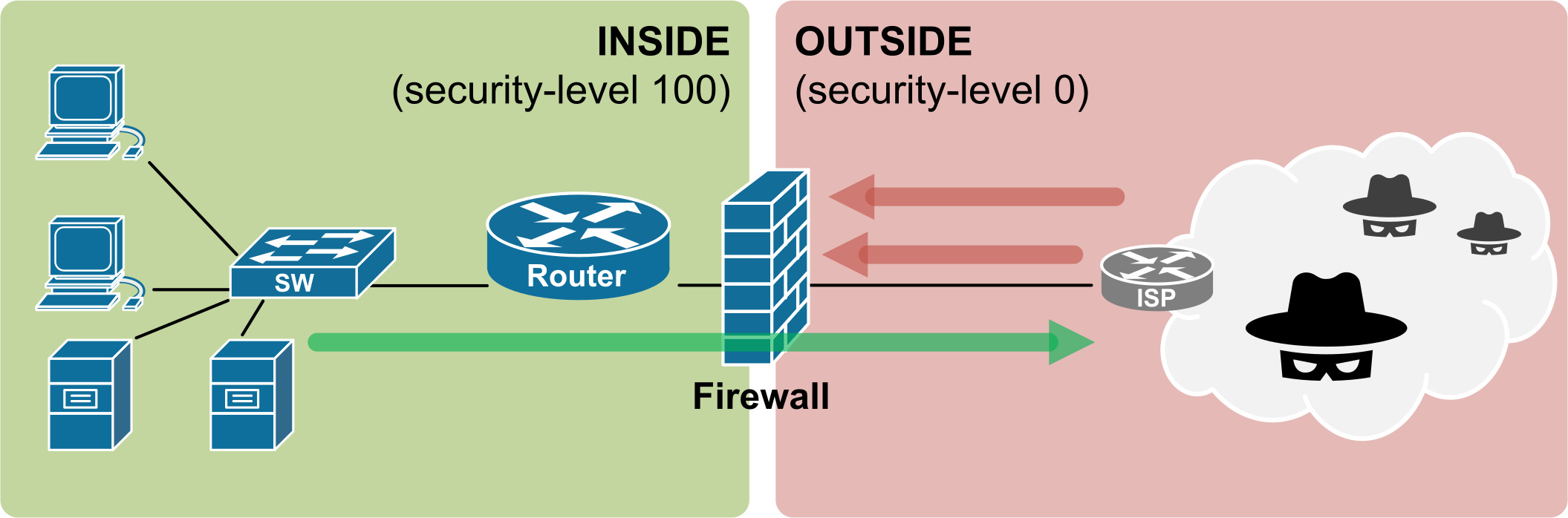 به طور پیشفرض، جریان ترافیک از سطوح امنیتی بالاتر به پایینتر (داخلی به خارجی) مجاز است، اما در جهت مخالف (خارجی به داخلی) مسدود میشود، مگر اینکه قوانین خاصی آن را اجازه دهند. این مفهوم باعث میشود که فایروال به طور پیشفرض مرز شبکه را امن کند. حتی اگر تیم امنیتی یک قانون فایروال هم ننوشته باشد، دستگاه از قبل از شبکه محافظت میکند، زیرا: