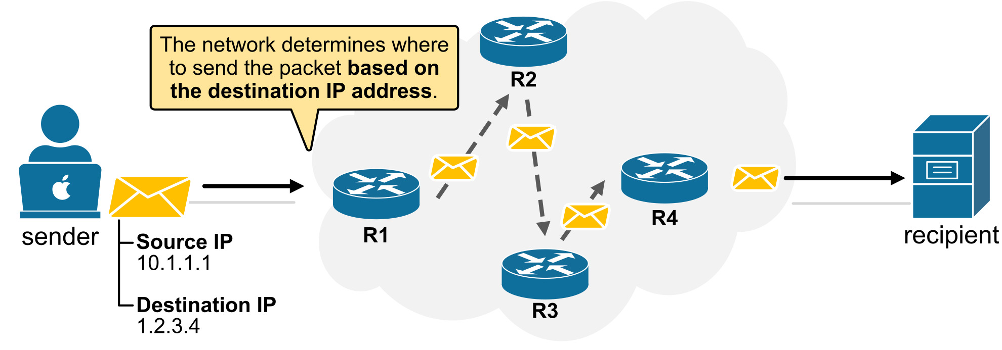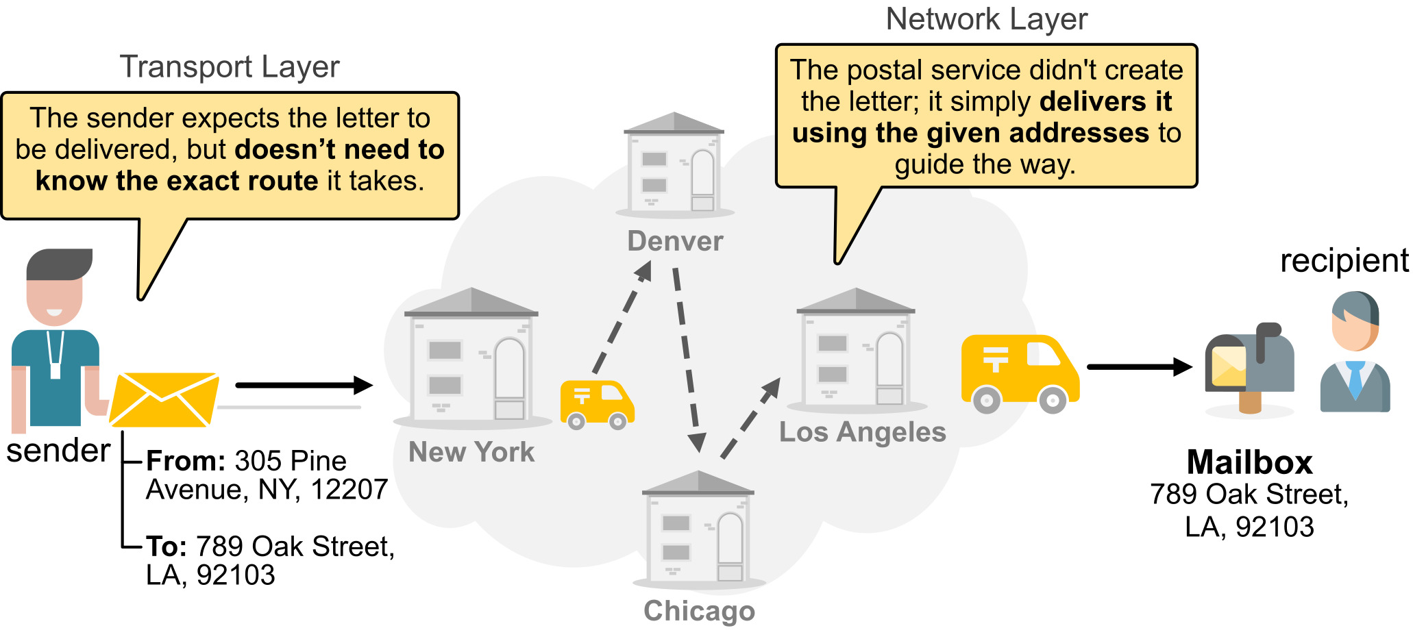از طرف دیگر، خدمات پستی نمیداند محتوای داخل پاکت چیست—وظیفه آن تنها تحویل نامه به آدرس گیرنده صحیح است. این سرویس باید بداند که چگونه نامه را از طریق کوتاهترین مسیر به آدرس مقصد مسیریابی کند.