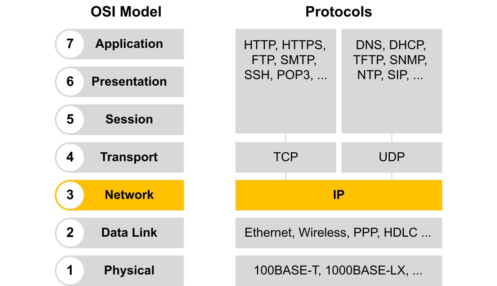 برخلاف سایر لایهها که از پروتکلهای زیادی استفاده میکنند، لایه ۳ در درجه اول از یک پروتکل استفاده میکند – IP (پروتکل اینترنت)، که دو نسخه دارد: IPv4 و IPv6.