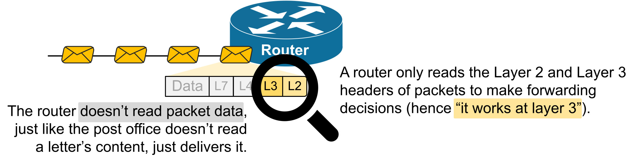این بدان معناست که مسیریابها هدر لایه ۳ بستهها را میخوانند و بر اساس آن اطلاعات تصمیمات هدایت (Forwarding Decisions) میگیرند، همانطور که در نمودار زیر نشان داده شده است. به همین دلیل است که میگوییم آنها در لایه ۳ فعالیت میکنند.