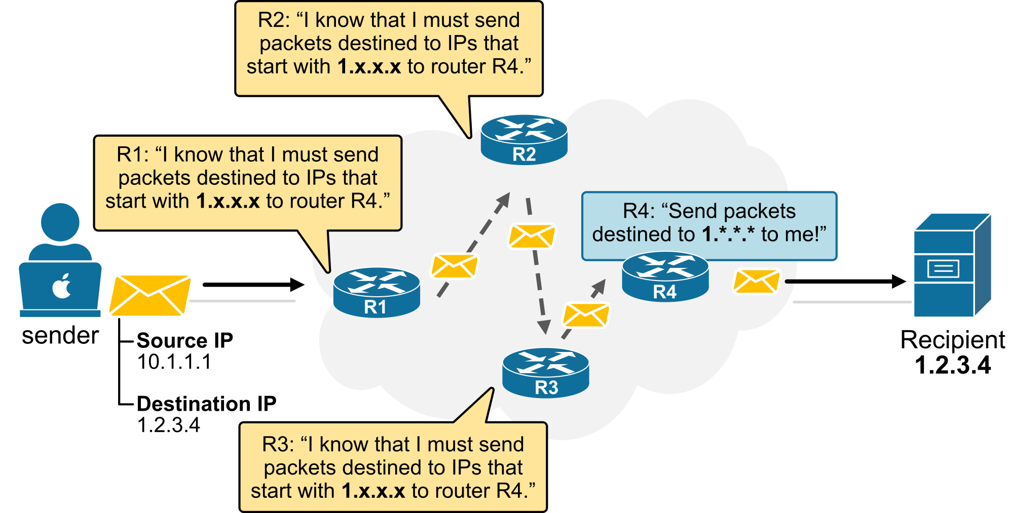 آدرسهای IP مانند کد پستی و آدرسهای خیابان عمل میکنند. یک مسیریاب در یک قسمت از شبکه نیازی به دانستن مکان هر آدرس جداگانه ندارد. تنها باید بداند که بلوکهای فضای آدرس در کجا قرار دارند. به عنوان مثال، R1 میداند که بستههایی که مقصدشان آدرسهای IP با شروع 1.*.*.* است، باید به R4 ارسال شوند، همانطور که در نمودار زیر نشان داده شده است.