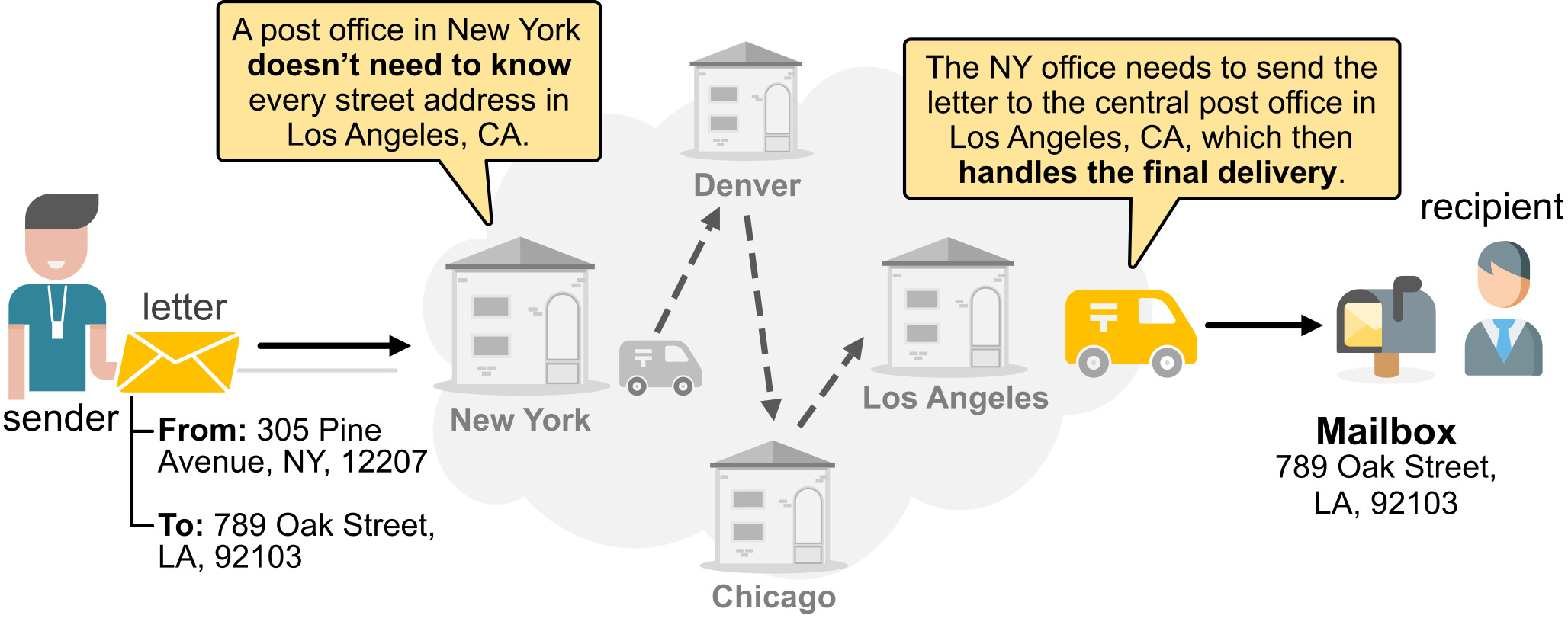 بیایید به مثال ارسال نامههایمان برگردیم. یک اداره پست در نیویورک نیازی به دانستن آدرس هر خیابان و هر خانه در کالیفرنیا ندارد. به سادگی نیاز دارد که بداند نامهای که مقصد آن لس آنجلس است، باید به اداره پست مرکزی لس آنجلس ارسال شود، که آن اداره میداند خیابان و کد پستی دقیق در منطقه آنها کجاست.