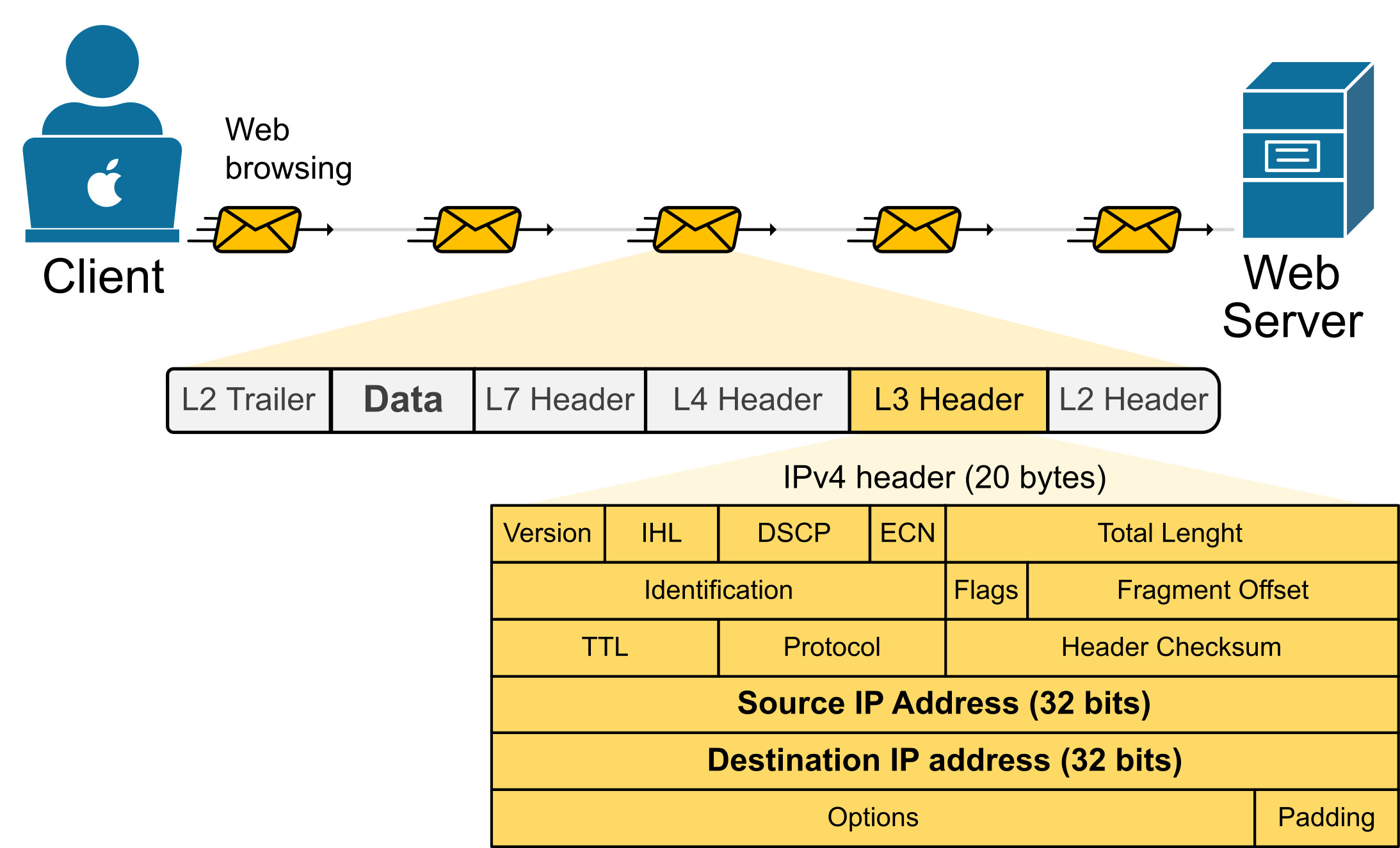 در هدر لایه ۳ بستهها، دو نوع آدرس IP وجود دارد: منبع و مقصد.