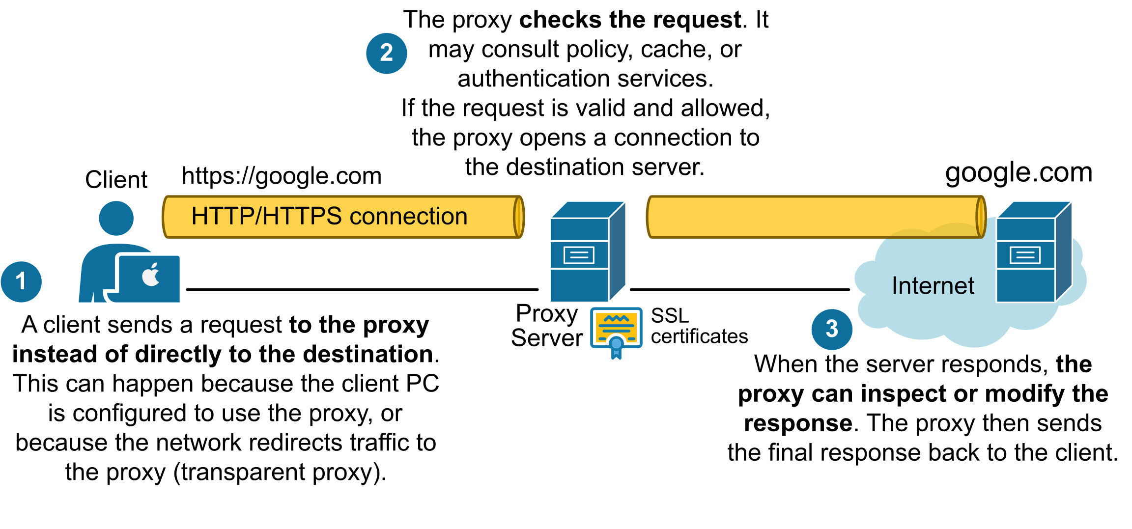 ۱. کلاینت به جای ارسال مستقیم درخواست به مقصد، آن را به پروکسی میفرستد. این اتفاق میتواند به این دلیل رخ دهد که کلاینت با تنظیمات پروکسی پیکربندی شده است، یا به این دلیل که شبکه ترافیک را به سمت پروکسی هدایت میکند (Transparent Proxy). ۲. پروکسی درخواست را بررسی میکند. ممکن است با سیاستهای امنیتی، حافظه کش یا سرویسهای احراز هویت مشورت کند. ۳. اگر محتوای درخواستی در حافظه کش باشد و معتبر باشد، پروکسی بلافاصله آن را برمیگرداند. در غیر این صورت، پروکسی اتصالی به سرور مقصد برقرار کرده و درخواست را فوروارد میکند. ۴. وقتی سرور پاسخ میدهد، پروکسی میتواند پاسخ را بازرسی یا اصلاح کند. سپس پروکسی پاسخ نهایی را به کلاینت برمیگرداند.