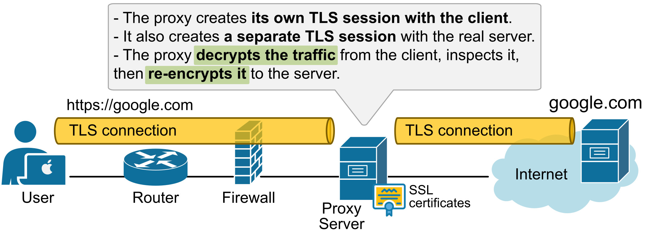 تنها راه برای دیدن محتوای رمزگشایی شده این است که دستگاهی داشته باشید که اتصال TLS را در میانه مسیر قطع (Terminate) کند. شما به یک «واسطه» (Middleman) نیاز دارید. یکی از وظایف اصلی سرورهای پروکسی این است که ترافیک TLS را رمزگشایی کرده، آن را بازرسی کنند و سپس برای ارسال به سرور خارجی، مجدداً آن را رمزنگاری کنند (مطابق شکل زیر). سرور پروکسی به عنوان واسطه بین کلاینتها و سرورها عمل میکند.