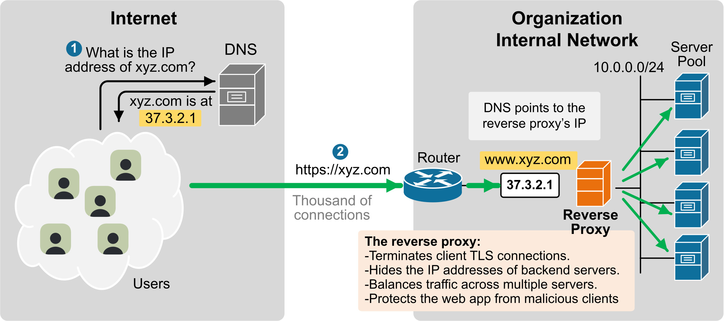 پروکسی معکوس (Reverse Proxy): نماینده یک یا چند سرور برای کلاینتهای خارجی است. درخواستهای ورودی را مدیریت کرده و میتواند توزیع بار (Load Balancing)، خاتمه TLS و امنیت برنامههای تحت وب را فراهم کند.