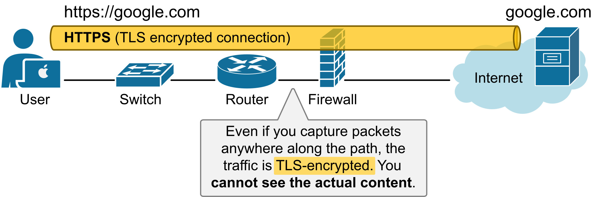 حتی اگر بستهها (Packets) را ضبط کنید، فقط آدرسهای IP مبدأ و مقصد، پورتها و پیامهای دستدهی (Handshake) مربوط به TLS را خواهید دید. با این حال، محتوای اپلیکیشن (مانند محتوای وبسایت و دادهها) را نخواهید دید زیرا رمزنگاری TLS آن را پنهان کرده است.