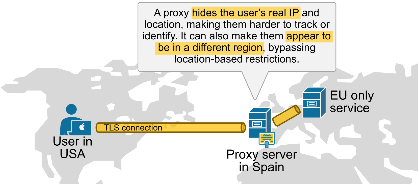 با این حال، کلاینت در این مثال از طریق پروکسی که در داخل اتحادیه اروپا قرار دارد، به سرویس مذکور متصل میشود. پروکسی اتصال TLS کلاینت را خاتمه داده و اتصال دیگری با سرویس برقرار میکند. در این حالت، سرور اتحادیه اروپا اتصال ورودی را به گونهای میبیند که گویی از اروپا منشأ گرفته است و اجازه دسترسی میدهد.