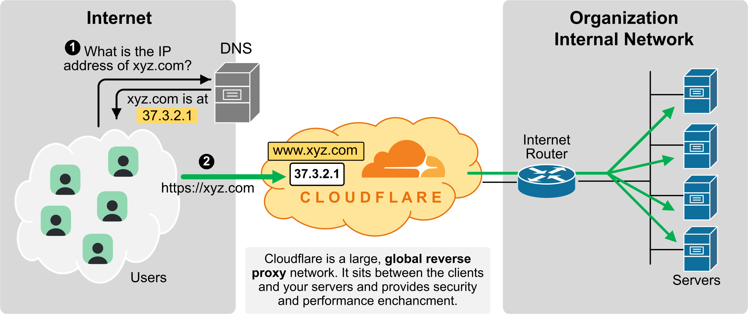 امروزه اکثر قابلیتهای پروکسی معکوس به صورت SaaS (نرمافزار به عنوان سرویس) مصرف میشوند. برای مثال، Cloudflare پرکاربردترین پروکسی معکوس جهانی است که در ابر قرار دارد (مطابق شکل زیر). این سرویس بین یک وبسایت و بازدیدکنندگان آن قرار میگیرد و به عنوان یک سپر و تقویتکننده عملکرد عمل میکند.