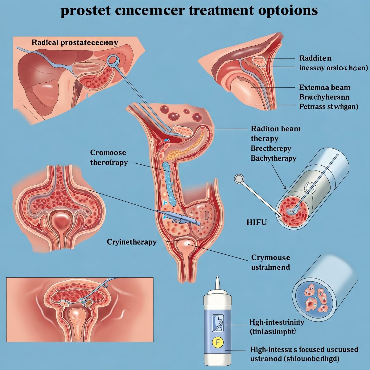 جراحی رادیکال پروستاتکتومی: برداشتن پروستات برای درمان سرطان در این روش، کل غده پروستات و گاهی بافتهای اطراف آن برداشته میشود. انواع جراحی عبارتند از: * جراحی باز * جراحی لاپاراسکوپیک * جراحی رباتیک (دقت بالاتر) عوارض احتمالی شامل بیاختیاری ادرار و اختلال نعوظ است که قابل مدیریت هستند.