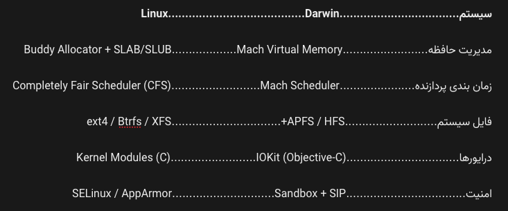 تفاوت مهم: در Darwin، فقط اپل میتونه درایورهای رسمی منتشر کنه. در Linux، هر توسعهدهندهای میتونه ماژول خودش رو بسازه.