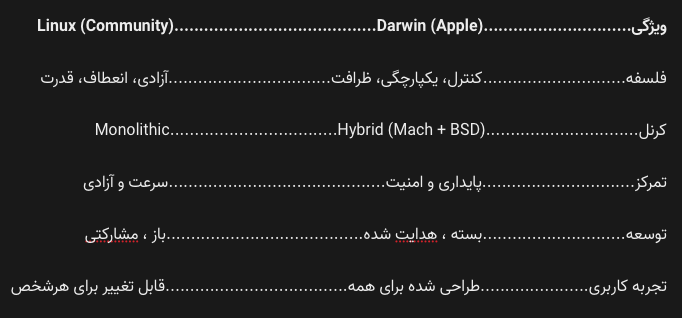 تفاوت مهم اینجاست که در Darwin، تمام لایهها باید با سیاستهای اپل هماهنگ باشند (مثل IOKit برای درایورها)، در حالی که در Linux هر زیرسیستم توسط گروه جداگانهای از توسعهدهندگان پیش میره.