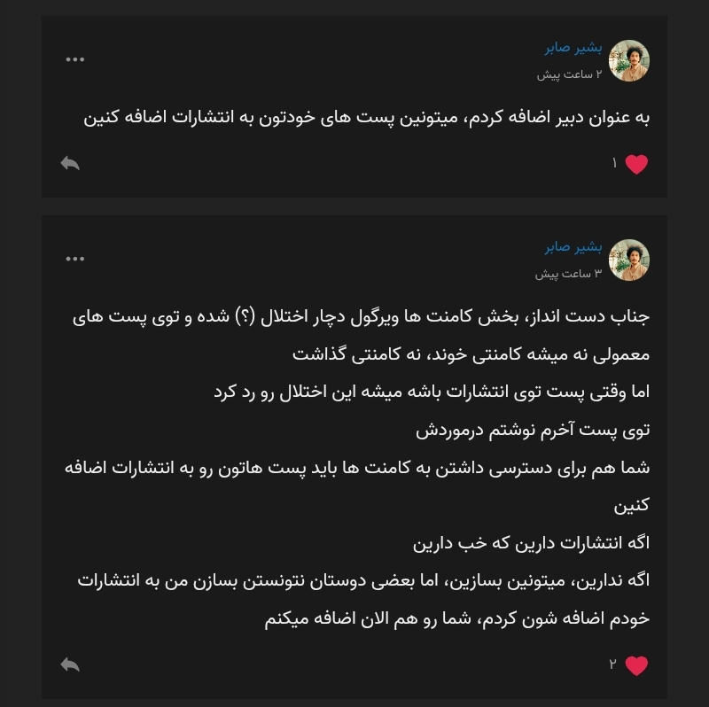 دست مریزاد بشیر جان ولی یادداشتها را که به انتشارات اضافه میکنم تازه فقط میتوانم نظرها را ببینم ولی همچنان نمیتوانم پاسخی به نظرها بدهم. و در این میان ماندهام چگونه هنوز برخی میتوانند زیر پُستهایم نظر بنویسند؟!
