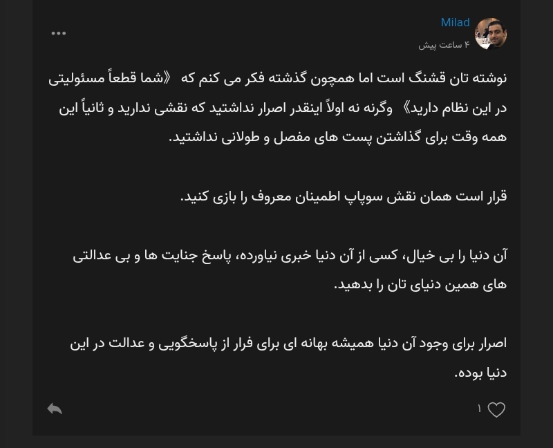 مگر در این نه سالی که در ویرگولم از مردم دور بودهام؟ به چه کسانی مردم میگویید؟ آیا مردم تنها همان کسانی هستند که با شما همسو و همفکر هستند؟
