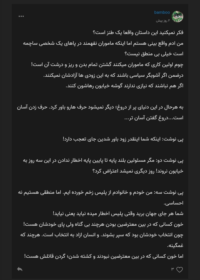 خیر این داستان طنز نیست. چون آن را از دهان یک کمدین استنداپ نشنیدم. حاضرم آبها که از آسیاب افتاد آدرس ایشان را بدهم تا حضوری با وی صحبت کنید تا متوجه شوید که از صفر تا صد این نوشته که طنز و غیرمنطقی میپنداریدش اتفاق افتاده است. اصلاً نوشتن این روایت برای گلایه از بیمنطقی اتفاقات افتاده بود. اگر آشوبگر یا تروریست بودند و باید تیر میخوردند و دستگیر میشدند که دیگر روایتی نمیماند. میماند؟!